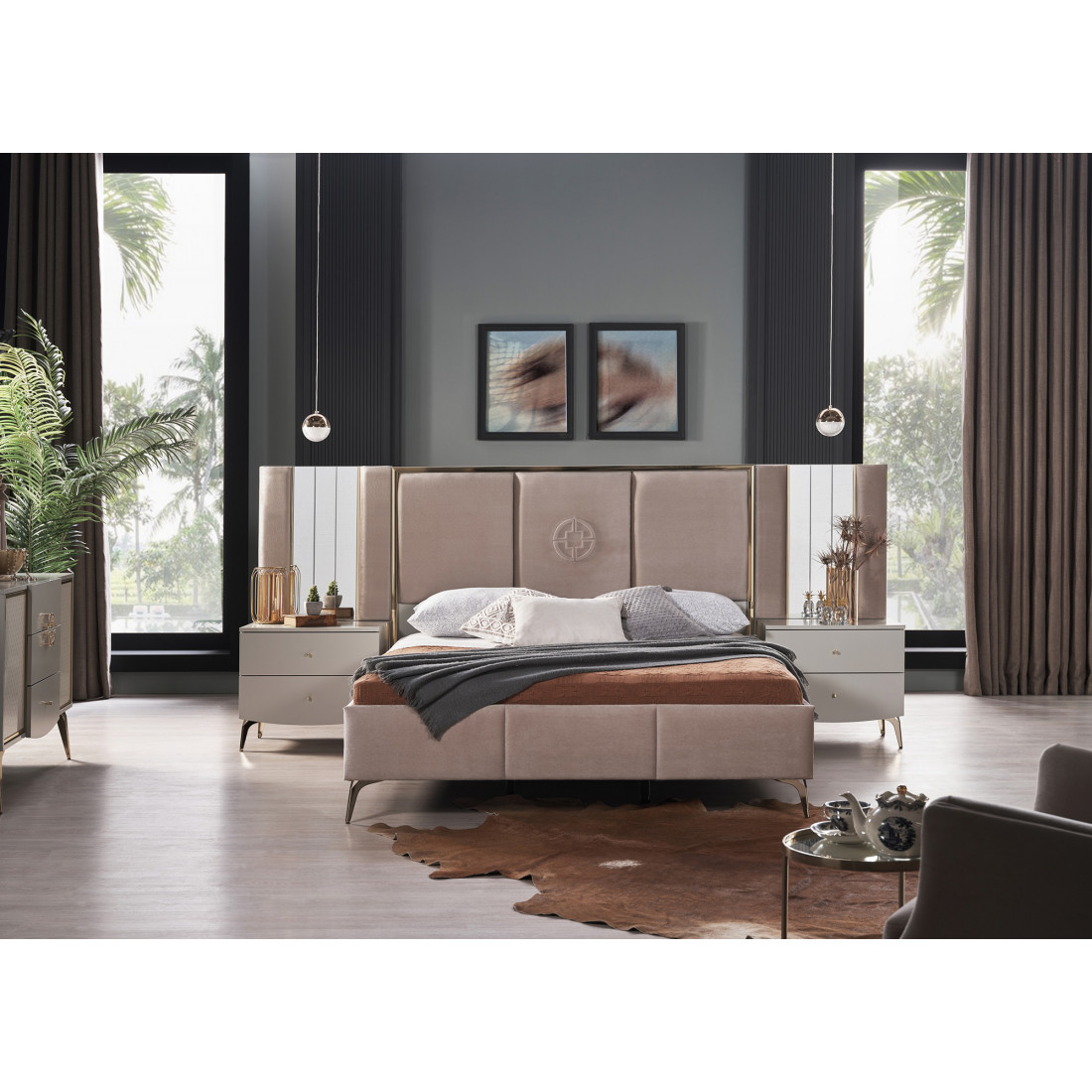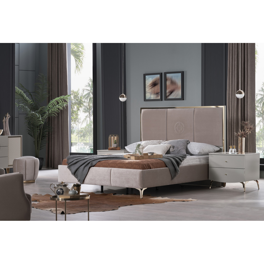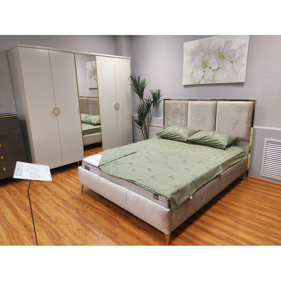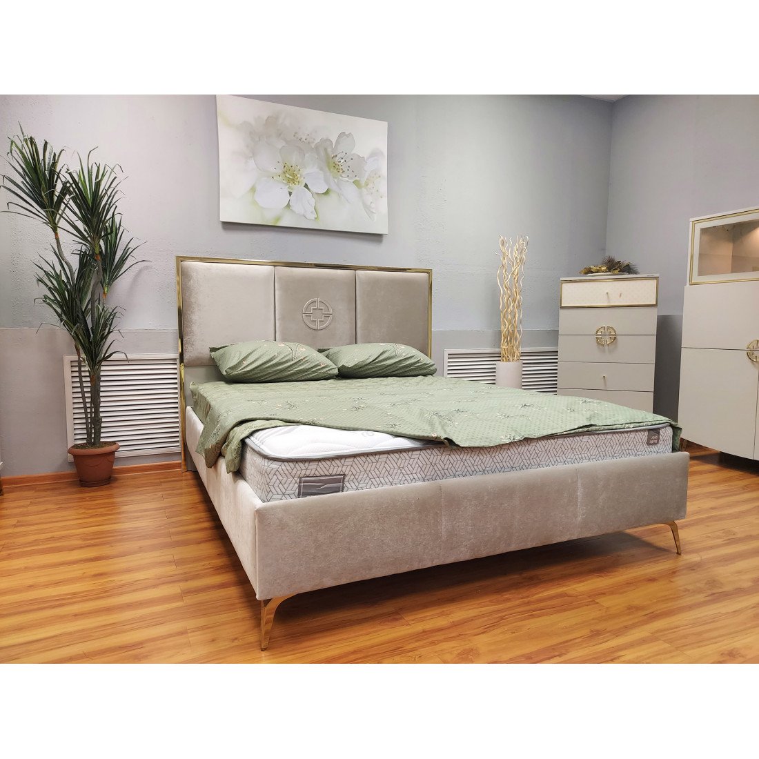 Спинка кровати щитовой конструкции из облицовочной плиты ДСП, с боковым и верхним накладным декоративным профилем (плита МДФ), профиль декорирован фитилем в цвете золота.
