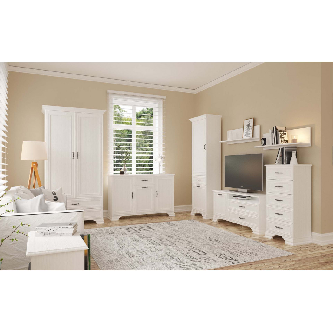 Мебель для гостиной Юнона композиция 4 от фабрики Мебель-Неман - это новинка 2019 года в классическом стиле с отделкой структурной фактуры, обрамленная рамочным фасадом, где металлические ручки выгодно подчёркивают стиль и изящество, всегда актуальна и востребована.