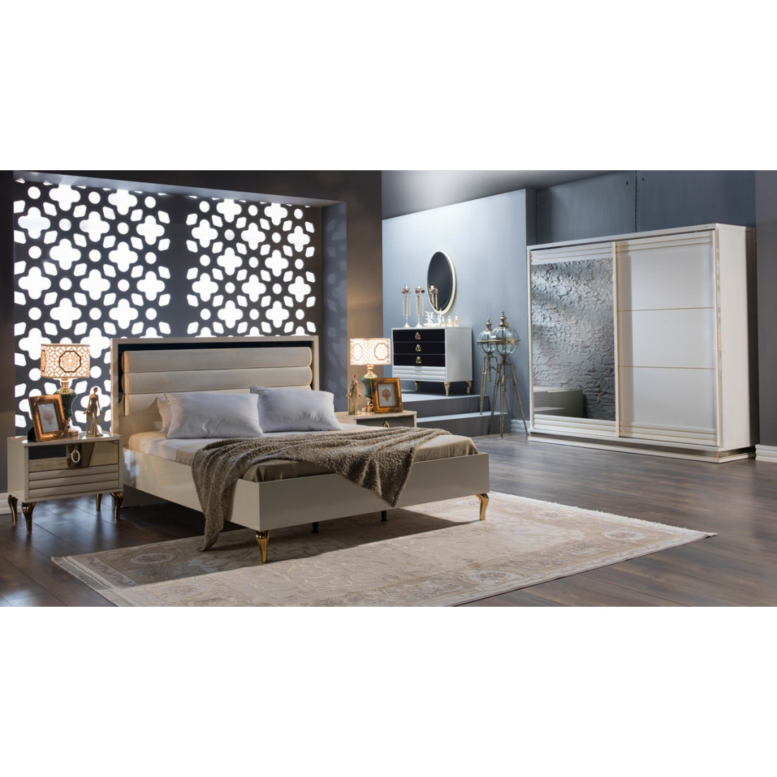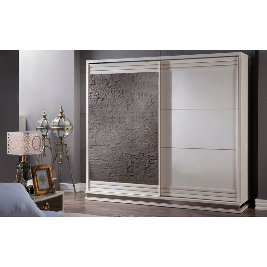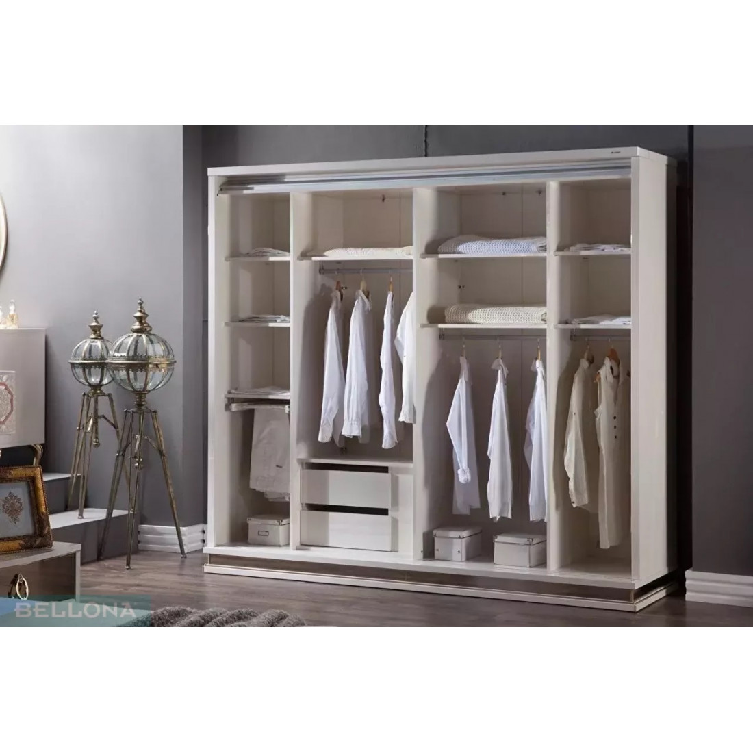 Шкаф купе ELIT-19 от турецкого производителя Беллона дополняет линейку шкафной группы коллекции Элит. Достаточно большой по своим габаритам: длина 235см, высота 2154см и глубина 70см, а так же вместительный. Внутреннее наполнение шкафа( показано на фото) прекрасно продуманно и позволяет очень грамотно разместить все необходимые вещи и постельные принадлежности. Комбинированные дверки отделаны золотистыми вставками и зеркальными поверхностями.
