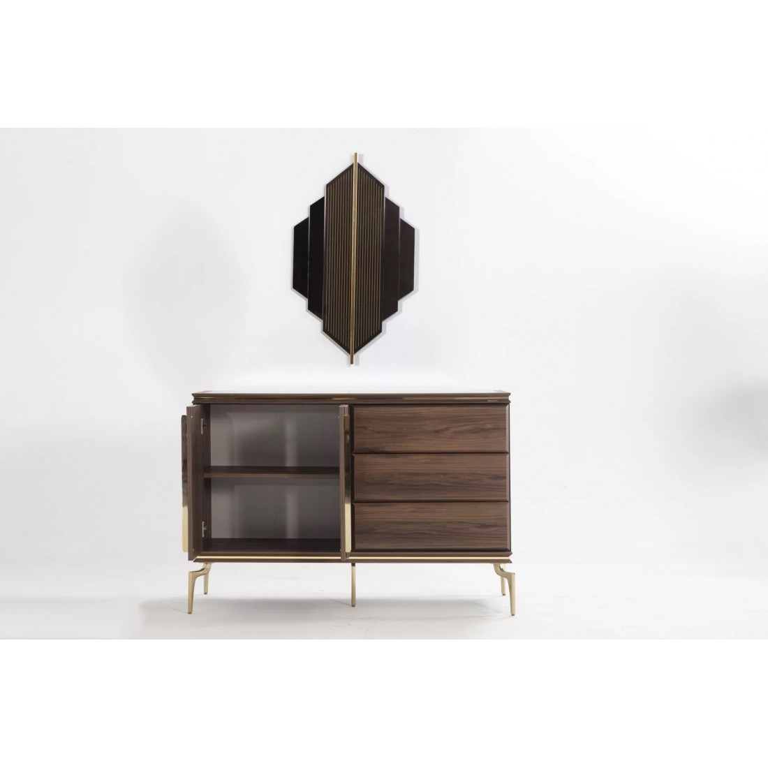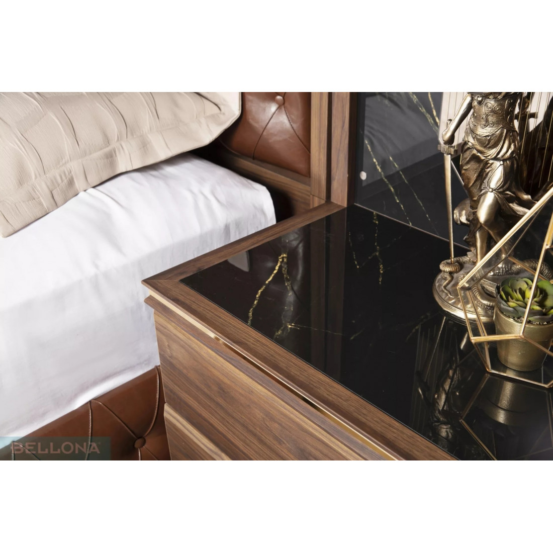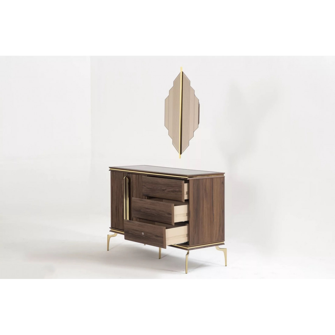 В цветовой конфигурации спальни "Montego" были предпочтительны цвета из черного мрамора с темным орехом. Специально разработанные для коллекции металлические ручки и ножки выполнены в ярко-золотом цвете, чтобы соответствовать стилю. Благодаря применению профиля в треугольной структуре, расположенной по всей системе, было получено визуальное богатство.