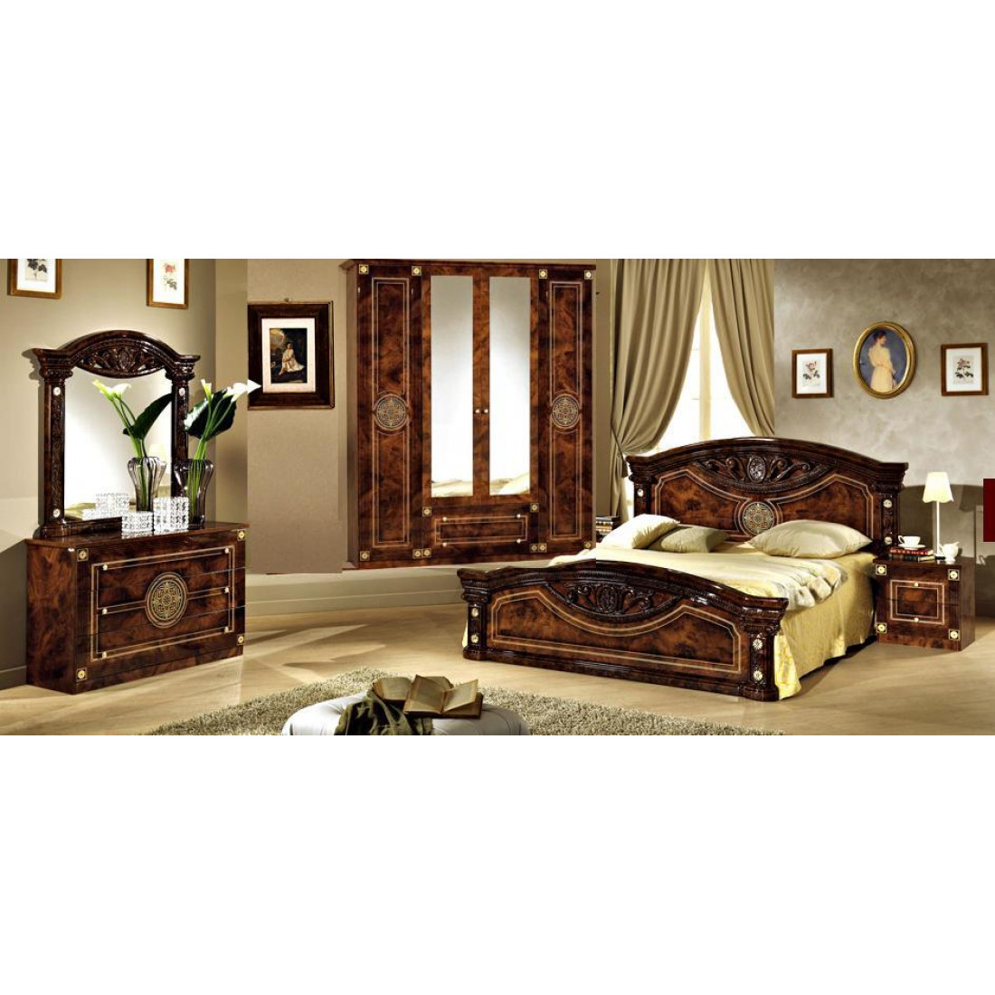 Спальня Рома (орех) от Российской фабрики «ДИА мебель» выполнена в строгом, классическом стиле. Ореховый цвет в сочетании с глянцевым покрытием придает элегантность. Такая спальня поможет Вам окунуться в атмосферу роскоши и комфорта. Безшумные и плавно закрывающиеся дверцы шкафа и комода помогут с легкостью забыть о шуме по утрам. Вся коллекция "Рома" предназначена только для истинных ценителей элегантного классического стиля.