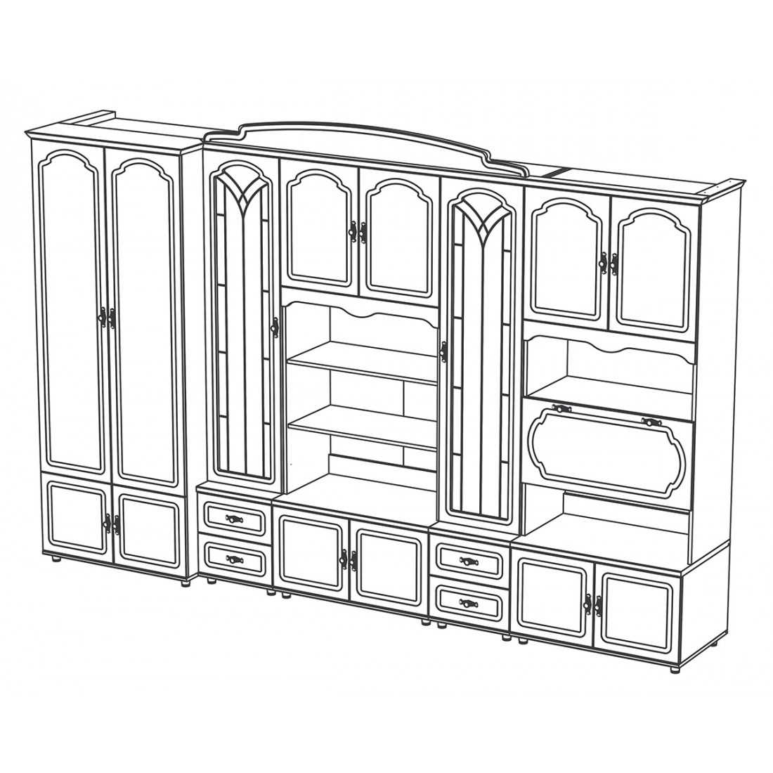 Стенка в гостиную "Романитка" не устаревающая классика на все времена.Длина стенки 3240мм, высота 2180мм, глубина 610мм. Вместительный шкаф для одежды, закрытые полочки для белья, ящики для хранения вещей , ниша под ТВ . Многофункциональная, в классическом цвете "орех темный" стенка в гостиную "Романитка ВК-09.01" отлично впишется в интерьер дома, квартиры, уютного коттеджа.