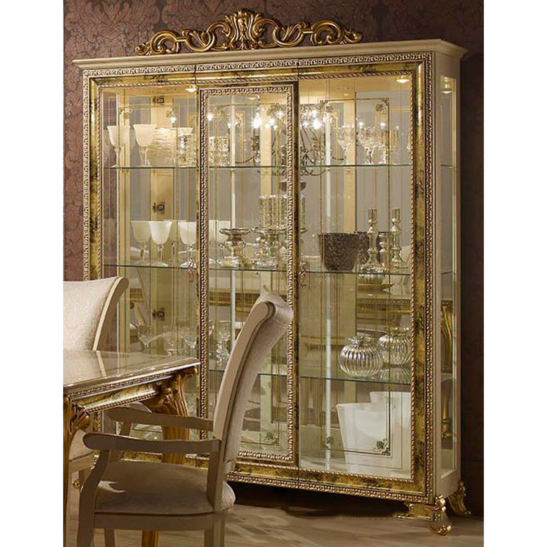 Шкаф-витрина трехдверная Катя (беж) - это элемент модульной системы в классическом стиле от Российской фабрики "ДИА мебель". Большие стеклянные полки и корпус из зеркала придаст чувства легкости и визуально поможет расширить комнату. Выполнена в бежевом цвете с элементами позолоты на фасаде. Такая шкаф-витрина удивит Вас своей компактностью и многофункциональностью.