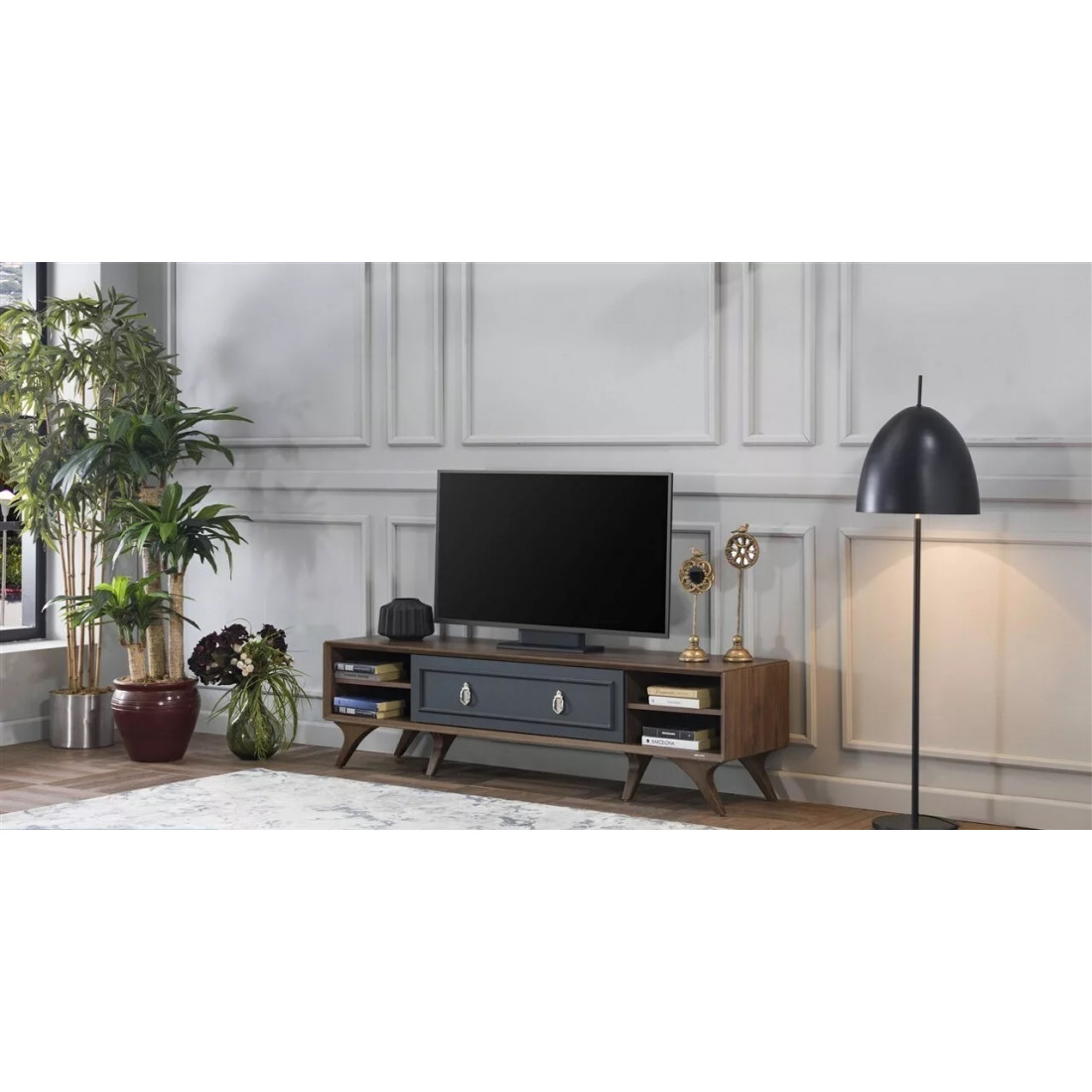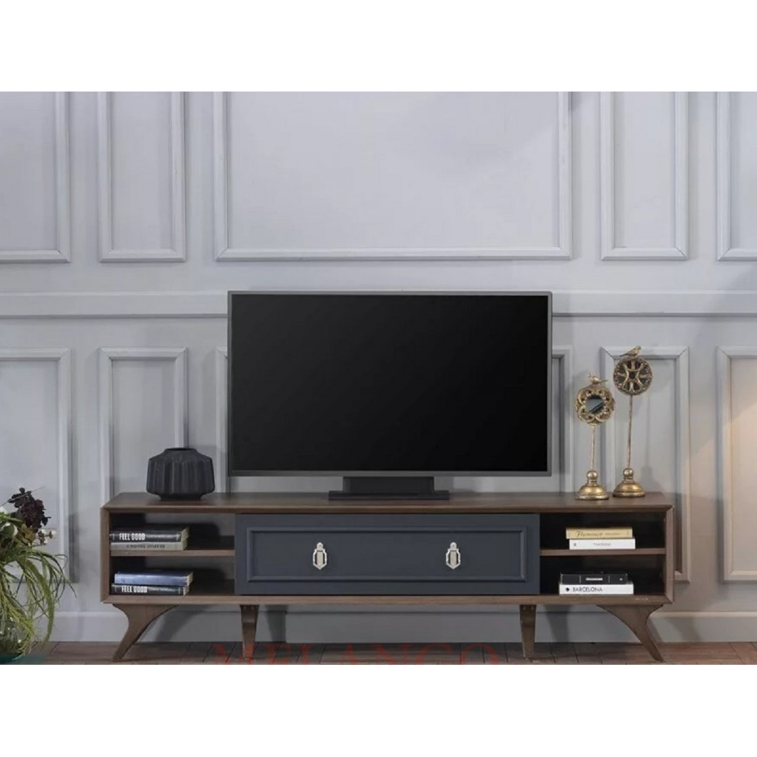 Тумба под ТВ в гостиную серии Алегро от Беллона  станет прекрасным, многофункциональным дополнением интерьера гостиной. Ручки образуют единый декоративный элемент, сходясь в центре фасадов. В качестве материала для фасадов, столешницы и ножек использовался МДФ.